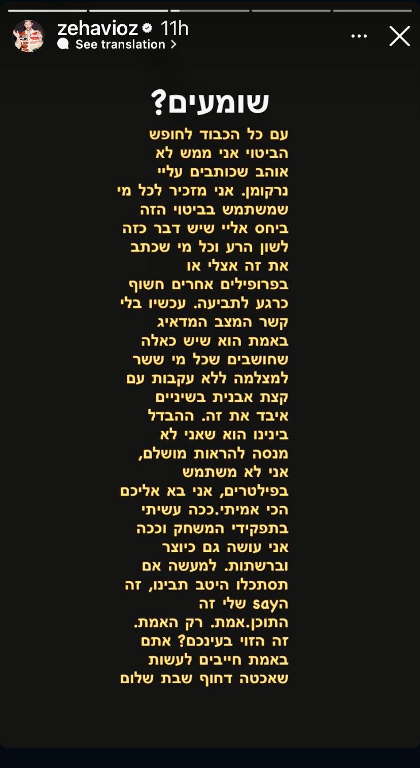 זהבי לא רק איים בתביעה, אלא גם פתח את הלב בניסיון להסביר את הסגנון הפרוע והאותנטי שלו ברשתות, שהוביל למטח התגובות: "יש כאלה שחושבים שכל מי ששר למצלמה ללא עכבות ועם קצת אבנית בשיניים איבד את זה. ההבדל בינינו הוא שאני לא מנסה להיראות מושלם. אני לא משתמש בפילטרים. אני בא אליכם הכי אמיתי". עוד הוסיף: "ככה עשיתי בתפקידי המשחק, וככה אני גם כיוצר וברשתות. זה ה־say שלי. האמת. רק האמת".