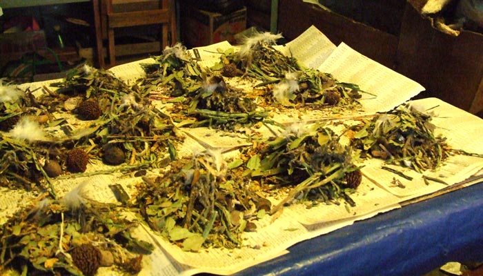 דוכן מנחות ובו סוכר צבעוני מוקשה, עשבים, סוכריות ועוד. צילום: גליה גוטמן