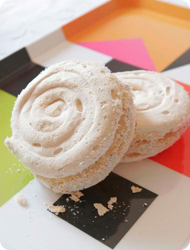 - מוסיפים את הקורנפלור והחומץ (תוך כדי הקצפה) עד שהם נטמעים בקצף. מעבירים את הקצף לשקית זילוף ומזלפים על גבי העיגולים המשורטטים בנייר האפייה מהמרכז החוצה בצורת שבלול.