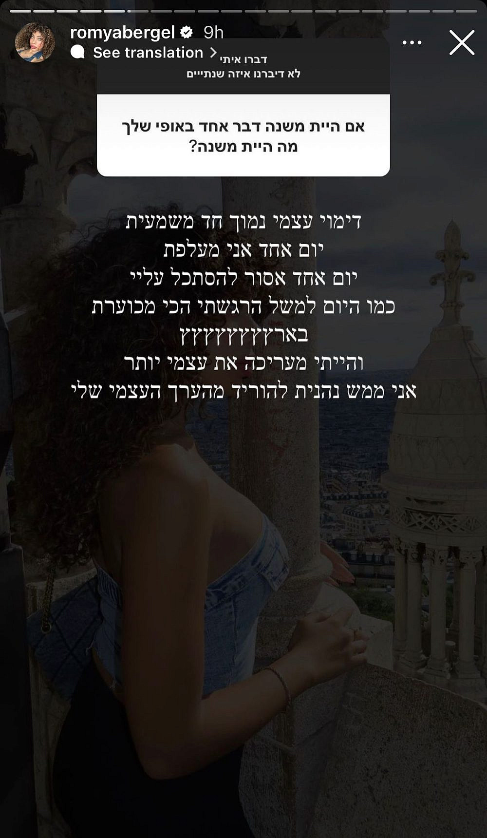 מתוך הסטורי של רומי אברג'יל | צילום: צילום מסך מאינסטגרם romyabergel@