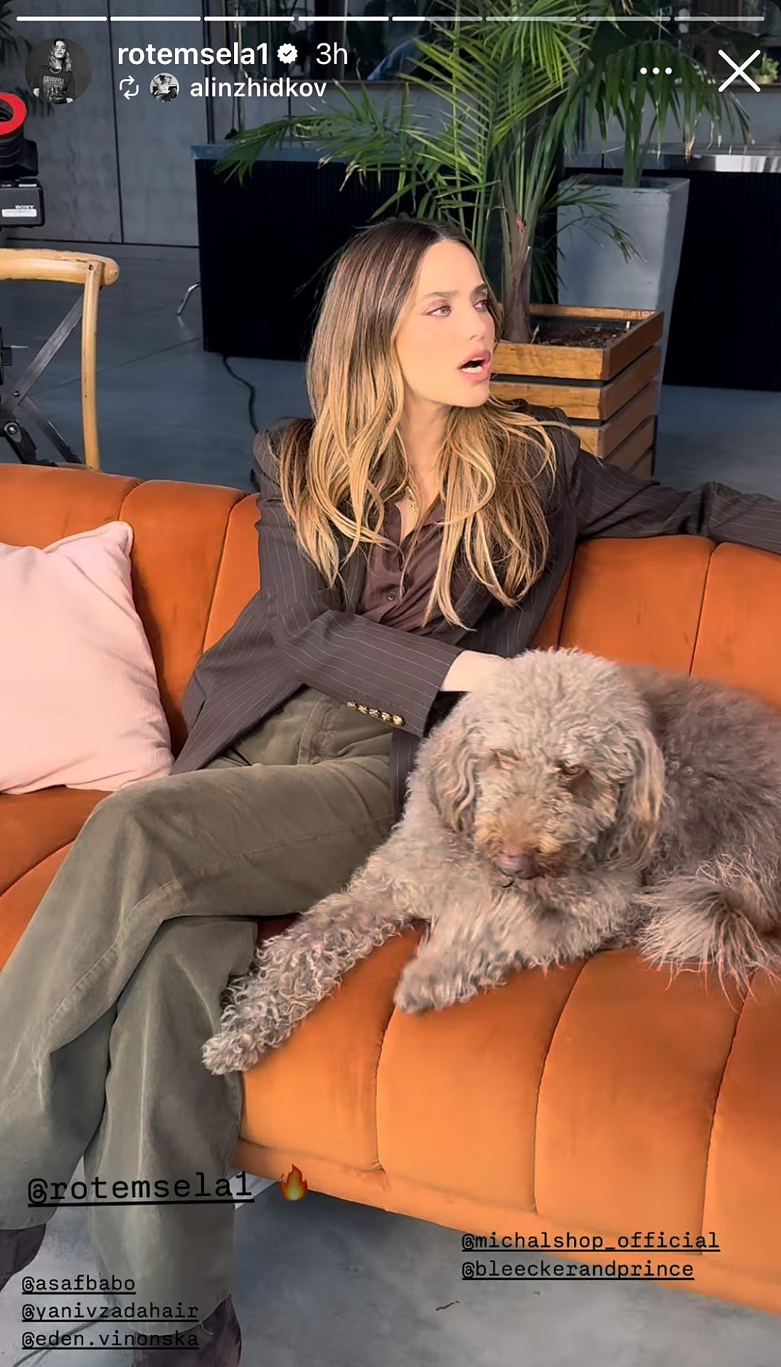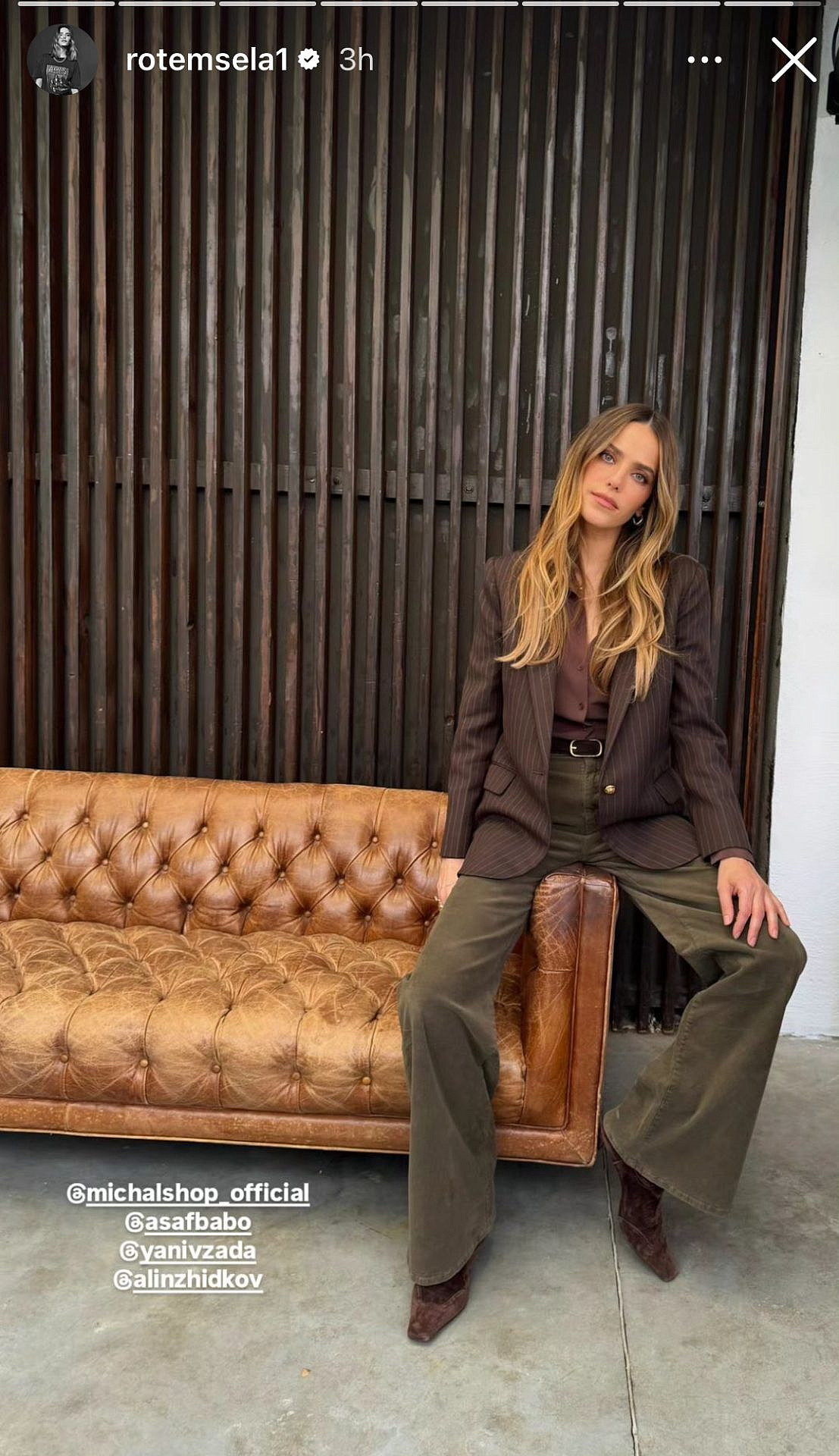 סלע שיתפה תמונות וסרטונים שתיעדה הסטייליסטית אלין זידקוב מסט הצילומים שבו הלבישה אותה, ונוכחנו לגלות את הדוגמנית, הפרזנטורית והמגישה האהובה לובשת חום מכף רגל ועד ראש. אבל יש כאן טוויסט: כל פריט חום באאוטפיט הזה הוא בגוון מעט שונה, כפי שאפשר להתרשם מהבדלי הגוונים בין החולצה המכופתרת, בלייזר פסי הסיכה הגברי, מכנסי הקורדרוי המתרחבים ומגפי הזמש בעלי האימום הקטום. ריבוי הגוונים והמרקמים מונע מכל העסק להפוך ללוק של אדון שוקו, או ליתר דיוק גברת שוקולדה. ויש עוד פיינל טאץ' חמוד: סלע הצטלמה עם הכלב המתוק והמקורזל שלה, שגם צבעו הוא חום.