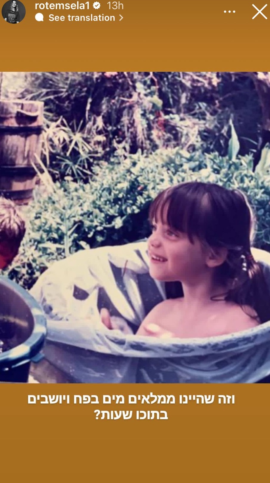 סלע העלתה תמונה נוסטלגית נוספת, כפי הנראה מגיל צעיר יותר, ובה היא מתועדת בעודה יושבת בתוך פח בחצר. "היינו ממלאים מים בפח ויושבים בתוכו שעות", הוסיפה סלע הסבר לתמונה. אנחנו הפכנו לשלולית רק מהחיוך המתוק שלה ומהפוני המשגע.