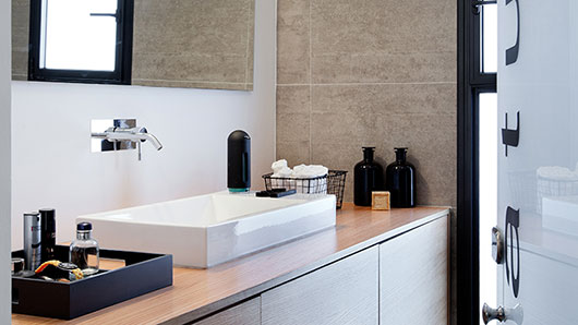 חדר הרחצה מרווח במיוחד ובפתחו הרחב הותקנה דלת מזכוכית חלבית שמופיע עליה הכיתוב "Get Natural". "הבחירה בדלת זכוכית", מסבירה מאיו־ינקוביץ', "נובעת מכך שיש חלון גדול במיוחד בחדר הרחצה, המחדיר פנימה אור יום רב, ודלת הזכוכית מאפשרת את מעבר האור פנימה אל תוך הבית". "הכיתוב", היא מחייכת, "הוא חלק מן הלוגו של משרד התיירות השווייצרי, המעודד טיולים בחיק הטבע". חדר הרחצה רוצף באריחים שחורים גדולים וקירות החדר חופו באריחים אפורים, המתכתבים עם קורות התקרה החשופות בבית. קיר אחד במקלחון חופה באריחים דמויי עץ עם חותמות של ארגזי מסע – שימוש באותיות ובמילים כאלמנט דקורטיבי שחודר גם אל חדר הרחצה. גם בחדר זה שולבו אלמנטים מעץ כדי להוסיף לו חום: סולם עץ משמש לתליית מגבות וארון גדול מפורניר אלון מתחת לכיור, שמצניע גם את מכונת הכביסה והמייבש. על משטח הרחצה שולבו פריטים מעוצבים מתמה, כמו מגש עץ שחור וצמד כוסות לבנות ואוסף מאובנים אמיתיים שבעל הבית אסף בטיוליו בעולם.