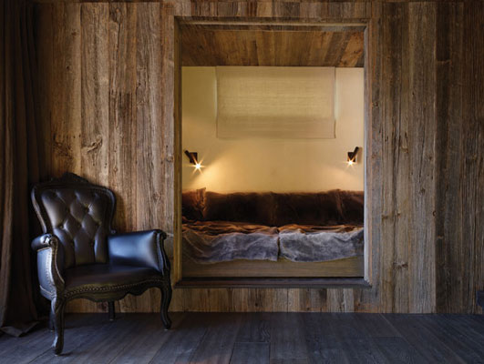 בחדר השינה של ההורים נבנתה יחידת שינה התחומה במחיצות עץ. המחיצות יוצרות חלל אינטימי יותר, המזכיר בקתת עץ במראהו. גם בעיצוב המטבח נעשה שימוש נרחב בעץ: בתקרת החלל, המחופה כולה בקרשי עץ, בספסלי עץ במראה ישן ובמשטחי העבודה, שעשויים מיציקת בטון המונחת על עץ. הרצפה היא רצפת אבן מקורית, שהייתה בעברה חיצונית לבית, ושילובה עם העץ מקנה תחושה של שייכות ושל פשטות כפרית.