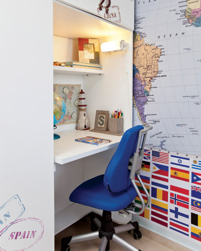 האפקט בחדרו של הבן מתקבל ממדבקות טפט של מפת העולם וממדבקות דגלי ארצות