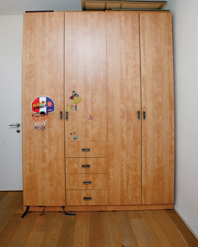 היא צבעה את כולו בלבן, ובעזרת שבלונות מיוחדות שהכינה במיוחד עבורנו עיטרה אותו בחותמות כמו במעברי גבול. את ידיות הפרחים שהיו קבועות בארון החליפה בלבול בידיות עור המדמות ידיות של מזוודות (טיראדור). כדי ליצור מקום אחסון נוסף בחדר, היא בחרה לשלב ראש מיטה עם מקום לאחסון ספרים וצעצועים (איקאה). כעת, אחרי שהרהיטים הגדולים והפונקציות המרכזיות טופלו, התפנתה בלבול לשלב הסטיילינג.