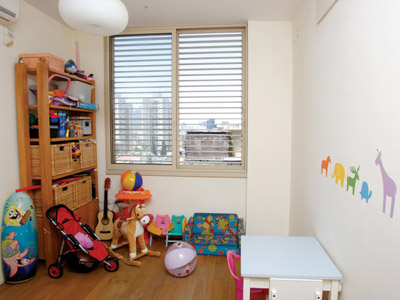 הווילון הילדותי שהיה תלוי על החלון הוחלף בווילון גלילה לבן וכמעט שקוף, שאינו תופס תשומת לב מיותרת בחלל הקטנטן ומשתלב בעיצוב הכולל. למריאן יש אוסף של דינוזאורים וחיות אחרות, וכדי להציגן בגאווה באופן שישתלב עם הקונספט הכללי, תלתה בלבול מדף ארוך מעל החלון. המדף אינו תופס מקום והשטח שהוקצה עבורו התאים בדיוק לאחסון של בובות קטנות.