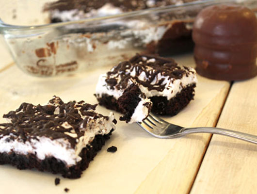 3. מפרידים את העוגיות מהקרמבואים. מציבים את הקרמבואים, ללא העוגיות, במרווחים שווים על פני העוגה אחרי שזו הצטננה מעט ומחזירים לתנור ל-5 דקות. מורחים את הקצף בעדינות על גבי העוגה בגב של כף.