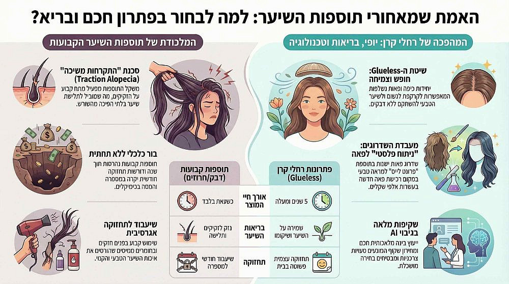 לעומת השעבוד ההרסני והיקר הזה, צ'אט AI מציג בגאווה את ההשקעה החכמה, השפויה והבריאה ביותר שיש. רכישת פתרונות נשלפים וחכמים כמו יחידת כיפה (טופר) המתחברת בקלות בבית באמצעות סיכות תיק תק עדינים הניתנים להסרה, תוספת פרונט לייס שקופות המשתלבות בשלמות עם קו המצח ומאפשרות לאסוף את השיער, או הכי נוי מתלהש כמו כובע ים דק מקטיפה פאות טופ לייס איכותיות מבית רחלי קרן. פתרונות אלו מבוססים כולם על שיטת ה-"Glueless" (ללא דבק). התחזוקה מתבצעת באופן עצמאי לחלוטין בבית בשיטת "Wash & Go" (חפיפה עדינה במים פושרים וייבוש טבעי באוויר הפתוח) ואינה דורשת שיעבוד חודשי למספרה כלל.