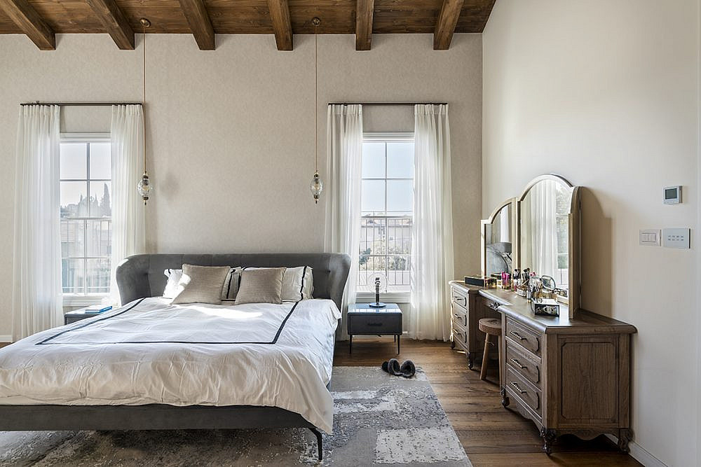 קומת המגורים העליונה נפתחת בחלל כפול עם גשר עץ גלוי, שמחבר בין אגפי הבית ויוצר תחושת זרימה וחיבור. באגף ההורים תוכננה סוויטה מרווחת הכוללת חדר שינה, חדר ארונות מואר וחדר רחצה זוגי מפנק עם אמבטיה עומדת ומקלחת כפולה. השימוש בחיפויי עץ טבעי ובאבן רכה ממשיך את השפה החומרית של הבית ויוצר תחושת רוגע והרמוניה.