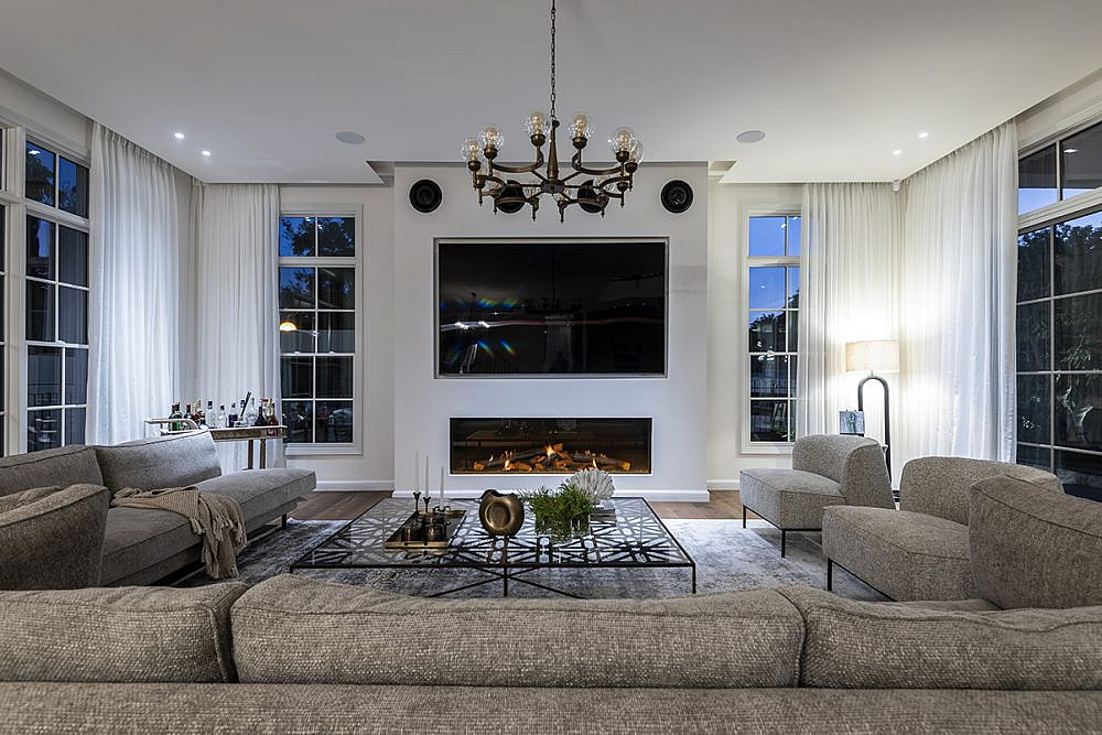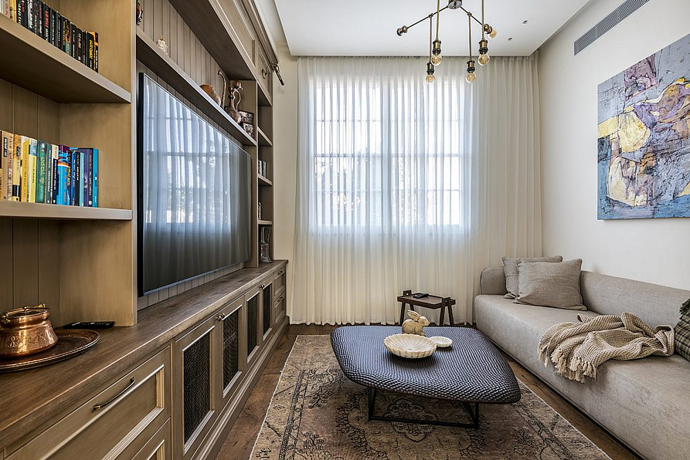 חדר המשפחה עוצב כפינה עוטפת, עם ספת רביצה רחבה, טקסטיל במרקמים רכים ופרטי עץ טבעיים. בימים שבהם הטמפרטורה יורדת מעט, נדלק הקמין הדקורטיבי מבית אורטל קמינים, שמעניק לחלל תחושת ביתיות וקסם חורפי מוקדם.