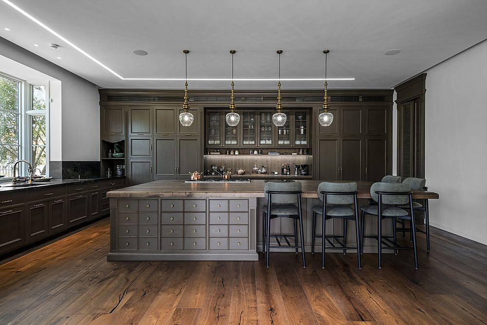 בקומת הקרקע ממוקמים המטבח, פינת האוכל, הסלון וחדר המשפחה – כולם משתלבים זה בזה במעברים פתוחים אך אינטימיים. המטבח המרווח, בגוון פליז חמים, כולל אי עבודה גדול, מזווה נסתר ונגרות מדויקת בהתאמה אישית. הריהוט, שתוכנן ונבחר בחברת OKNIN, מדגיש את קווי העיצוב הנקיים תוך שמירה על תחושת חמימות.