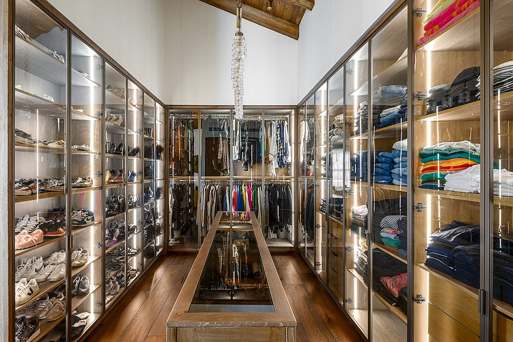 הבית תוכנן בצורת האות ר', כך שהוא נפתח אל גינה פנימית ובריכת שחייה המעוטרת באבן ירוקה רכה, המתחברת אל צבעי הסתיו. כבר בכניסה ניכרת ההקפדה על פרופורציות, פתחים גדולים שמכניסים אור טבעי רב, ושימוש בחומרים טבעיים – עץ, אבן וברזל – המתחברים זה לזה בהרמוניה טבעית. בעונה שבה האור נעים והשמש רכה, הבית מתמלא בזוהר חמים, והמעבר בין הפנים לחוץ כמעט ואינו מורגש.