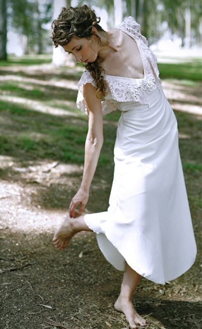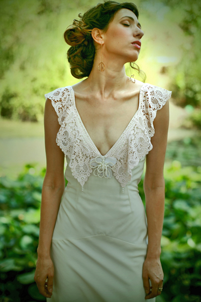 שמלת הכלה של גושטוזה מעוצבת בניחוח שנות השלושים, עם קרושה עבודת יד ופנינים. הגוונים הם בז'ים ורדרדים.